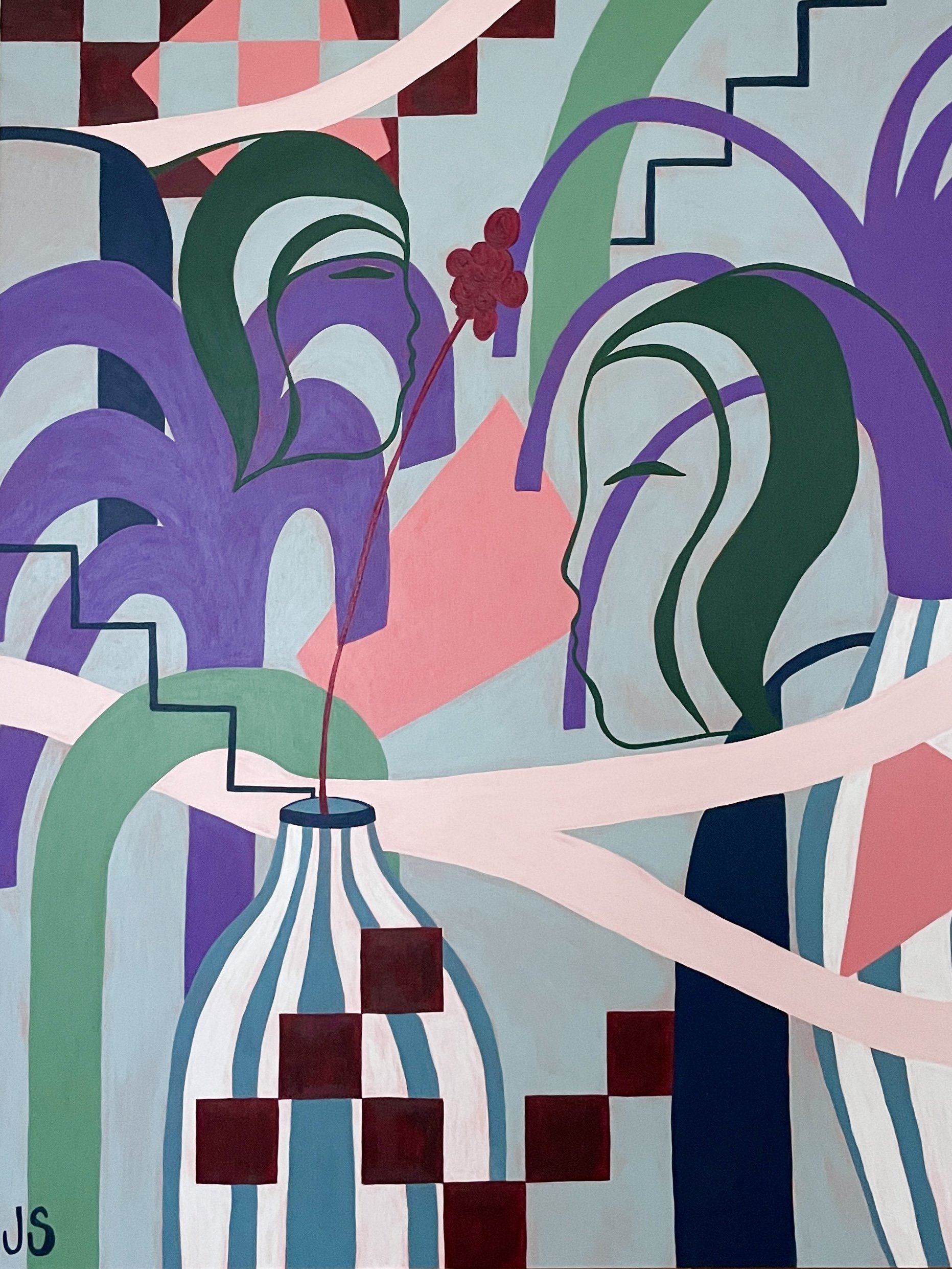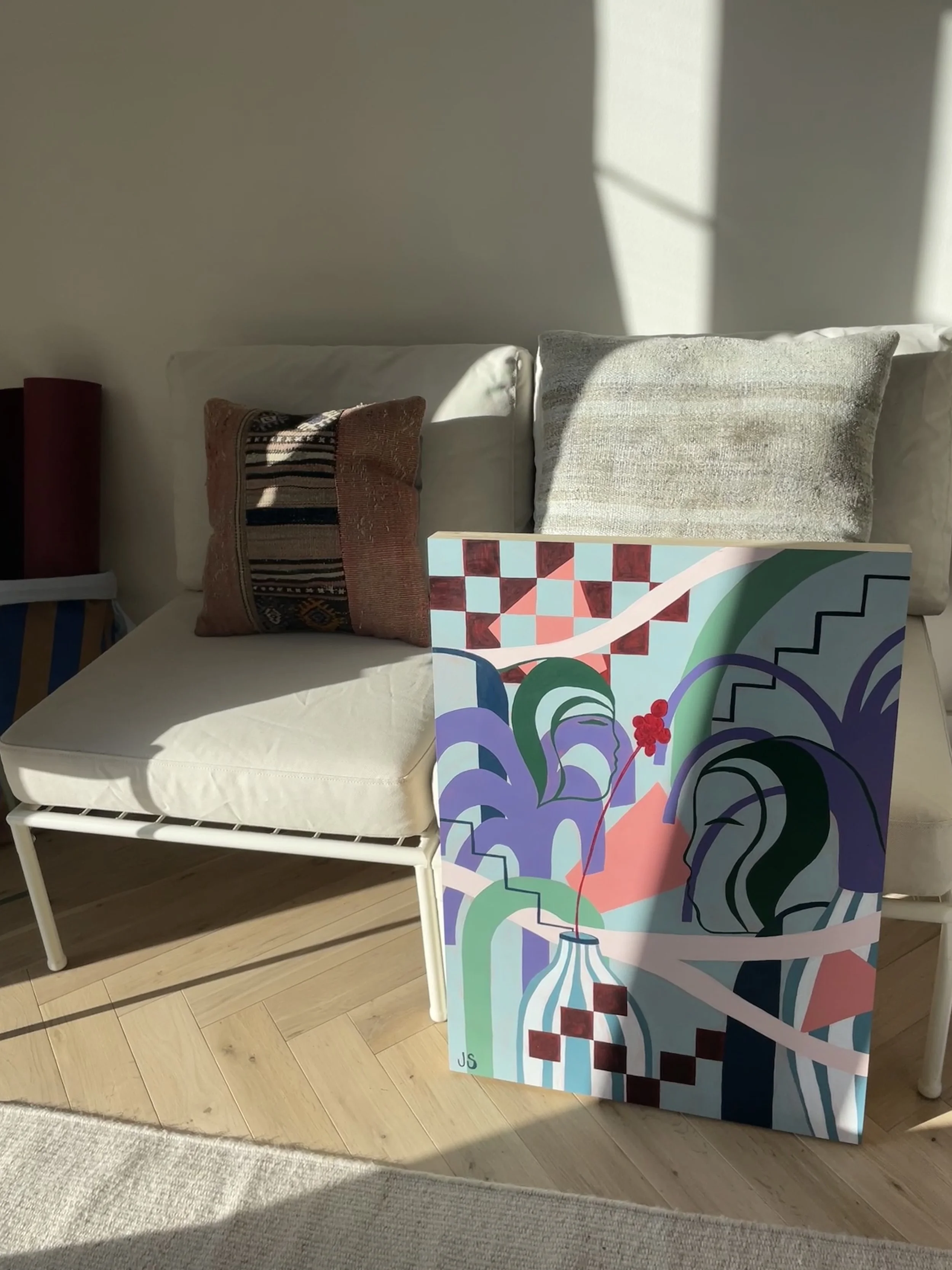 This beauty is 50 × 70 cm, acrylic on cradled wooden canvas with wire backing, ready to directly hang on your wall. This piece represents those fleeting moments of dialogue with the self, memories and thoughts flooding the brain in shapes and forms also in dialogue with one another.