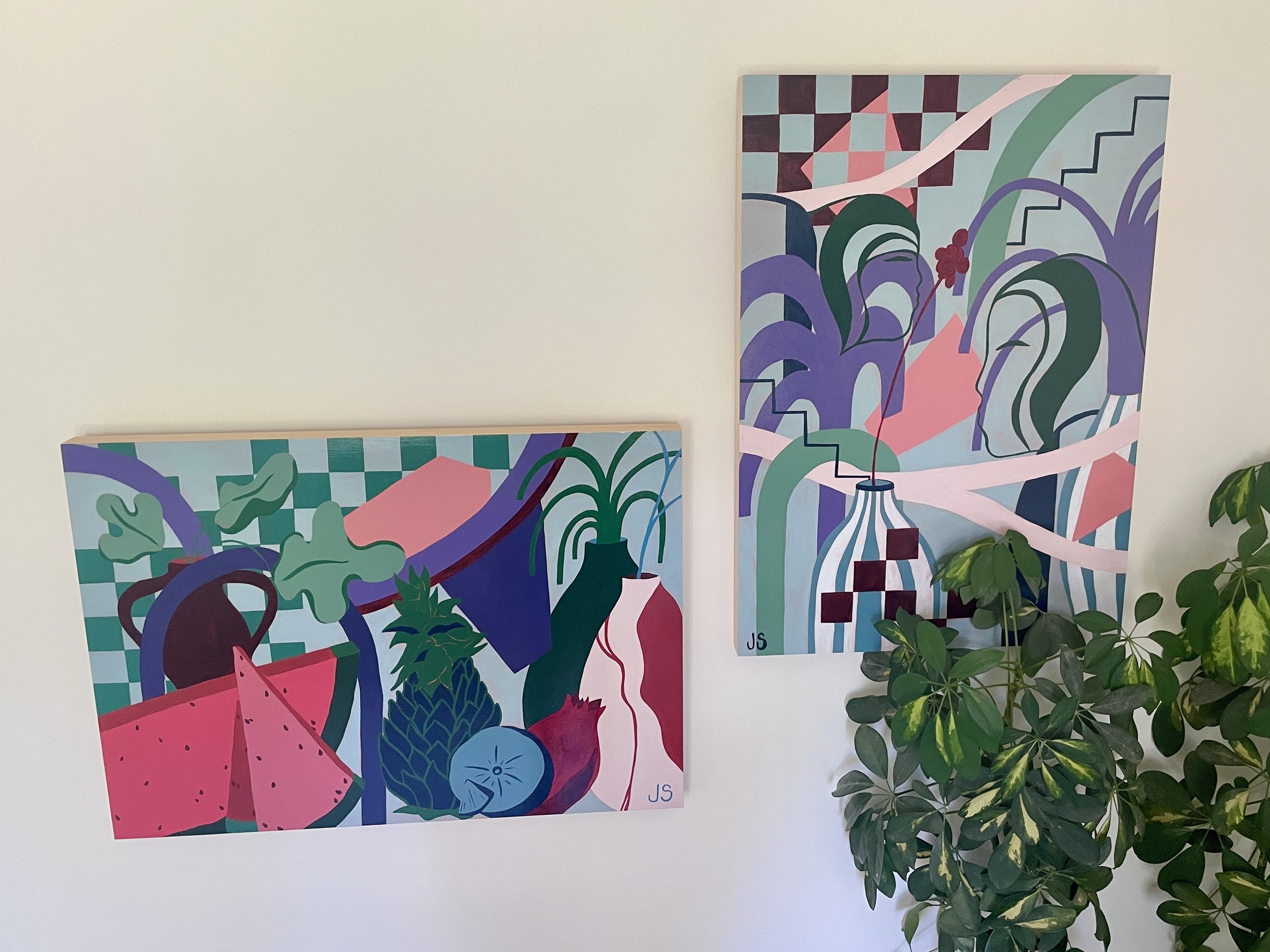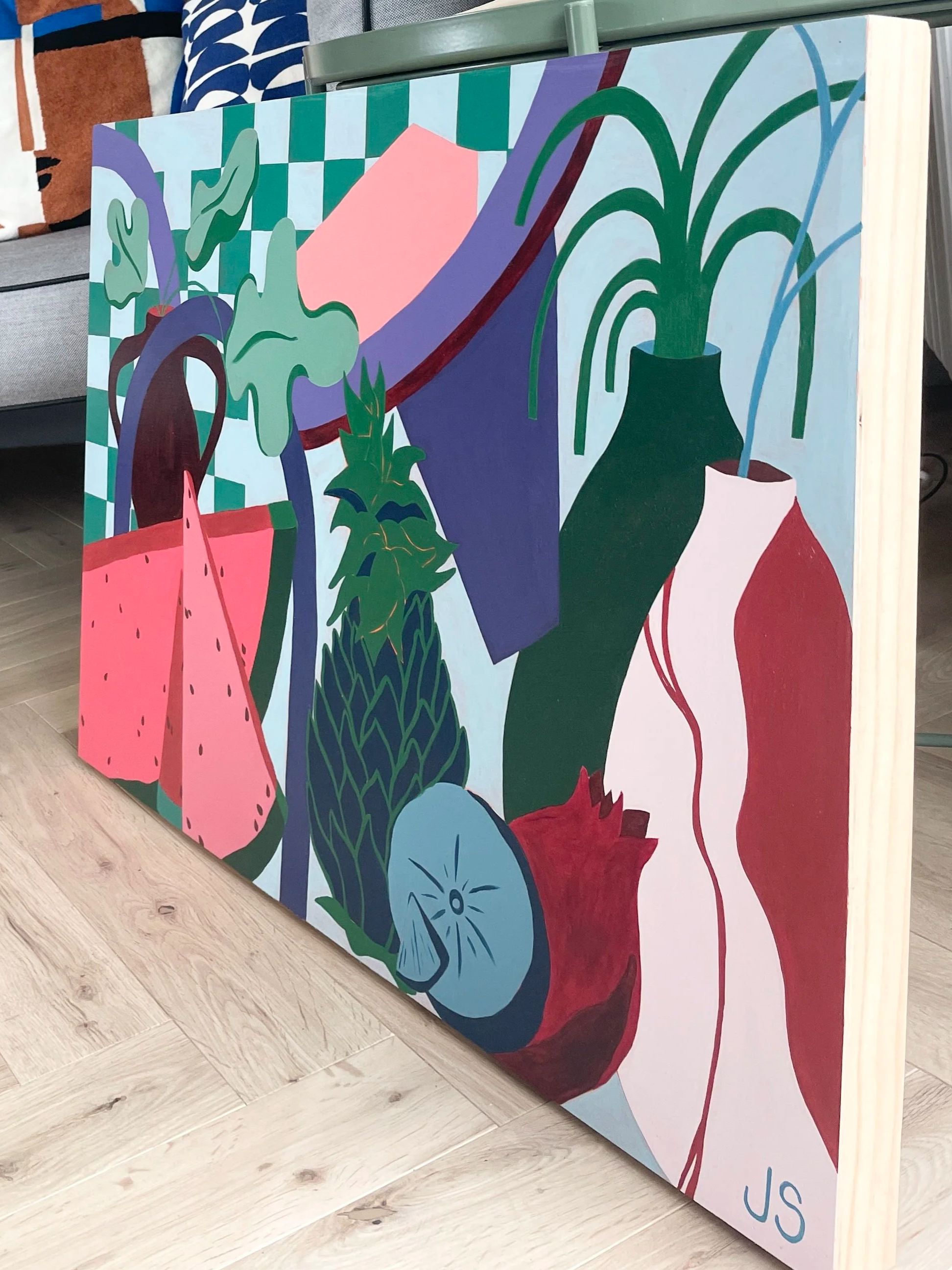 This beauty is 50 × 70 cm, acrylic on cradled wooden canvas with wire backing, ready to directly hang on your wall. This piece represents life through symbols of fruitfulness and creation. The growth of fig leaves, the abundance of the watermelon, humanity as manifested in the ancient art of pottery.